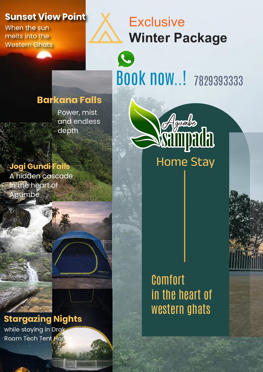 Located in the mist-laden hills of Agumbe, Agumbe Sampada offers a unique stay surrounded by rainforests, waterfalls, and clean mountain air. Our retreat is designed for those seeking quiet, nature, and a genuine connection with the environment